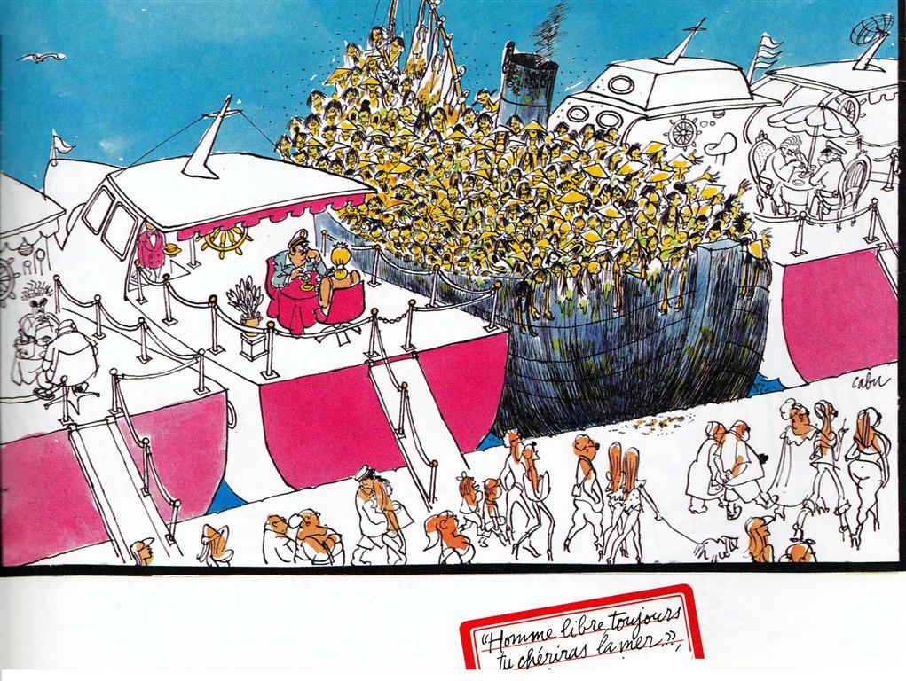 Un superbe dessin de Cabu (un de mes dessins préférés, un peu à la manière de Sempé) tiré de l'album "Camille-le-Camé contre Mon Beauf" (1980), un dessin toujours d'actualité même si à l'époque c'étaient les "boat people" venus du Vietnam...Cabu fut le Daumier de notre temps, en plus baba cool !