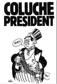 Le manifeste électoral « bleu blanc merde » de Coluche est un manifeste/canular à mi-chemin entre l’anarchisme bon enfant, le gag potache post-68 et l’inventaire à la Prévert version Charlie-Hebdo ; il n’est pas aussi sans rappeler Alphonse Allais et son Captain Cap (1902), satire caustique et fantaisiste du monde politique. Dans le « comité de soutien à la candidature de Coluche », on est assez peu étonné d’y trouver S.July, J.-L. Godard, R.Bouteille ou D.Cohn-Bendit mais un peu plus surpris de voir qu’un certain nombre d’intellectuels en vue tels Pierre Bourdieu, Gilles Deleuze ou Félix Guattari soutiennent cette candidature atypique. Le soutien d’un Bourdieu s’explique par le fait que le sociologue déclare « ne pas aimer les partis politiques », mais aussi parce qu’il croit très sérieusement aux vertus citoyennes de la « société civile », dont Coluche est alors pour lui le meilleur représentant. A tel point d’ailleurs qu’avec 12% (et même 16% dans certains sondages) d’intentions de vote, Coluche se prend au jeu et donc au sérieux ; il fait peur aux politiques et suscite contre lui une campagne de presse soigneusement orchestrée, où tous les coups bas sont permis. Lorsqu’il se retire de la course en avril 1981, Bourdieu lui-même stigmatise les professionnels de la politique qui ont «refusé à ce casseur de jeu le droit d'entrée, que les profanes lui accordaient massivement». Face au danger potentiel que représente cette candidature atypique de la dérision, le pouvoir - à gauche comme à droite, car Coluche a inquiété tous les appareils - reprend la main sans ménagement, en mettant en avant la défense des valeurs démocratiques et celle des institutions – et surtout la sacro-sainte fonction présidentielle. Le bouffon a outrepassé les limites à l’intérieur desquelles il a traditionnellement droit de tout dire et de tout faire. En fait, Coluche est à son tour la victime du processus de dérision qu’il avait cru pouvoir contrôler : se sentant rabaissés et humiliés, les gens « sérieux » fourbissent les mêmes armes (ironie, mépris, coups bas) pour disqualifier leurs adversaires. Dans la démocratie, Coluche a tous les droits sur les scènes du spectacle (comme Aristophane dans le cadre des Dionysies), mais il n'a plus les mêmes droits sur la vraie scène politique.