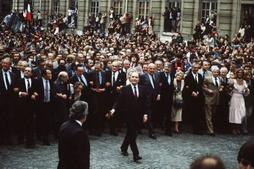 Le 10 mai 1981 au soir, la télévision annonce sur un écran minitel en trois couleurs l'élection du nouveau président. Au dehors, la fête populaire bat son plein toute la nuit à la Bastille et à la République. Jack Lang, l'inaltérable ministre de la culture, pourra dire quelques mois plus tard que « Les Français ont franchi la frontière qui sépare la nuit de la lumière ». C’est ce que l’on a appelé à l’époque « l’état de grâce » et il va durer en effet quelques mois. Le jour de son investiture, le 21 mai 1981, Mitterrand organise une grande cérémonie républicaine au Panthéon, grande opération de communication politique. Au son de la 9ème de Beethoven et de l’Hymne à la Joie, il remonte la rue Soufflot avec des dizaines d'amis politiques et va déposer une rose (en réalité, on lui tendra une rose à l'entrée de chaque salle) sur les tombes de Victor Schoelcher, de Jaurès et enfin de Jean Moulin. Cette cérémonie - assez éloignée on en conviendra de ce qui s'est passé en 2007 au Fouquet's - apparaît, avec le recul, très didactique, comme s'il avait paru nécessaire alors de relancer le grand récit national républicain, un peu en sommeil depuis la Libération. La gauche de mai 1981 se veut l'héritière de la république festive de 1790, 1848, 1880, 1936 et 1944 et ne tarde pas à le faire savoir. En septembre, le 8 mai est rétabli comme fête nationale chômée, fête de la paix de l'amitié et de la liberté et pas seulement de la commémoration de la victoire contre le nazisme. Quant au 14 juillet (81), Jack Lang veut lui redonner les couleurs civiques qu'il aurait perdues dans des célébrations trop militaristes, pas assez citoyennes (l'armée c'est le peuple). Et le 11 novembre est lui plus clemenciste tendance rad-soc que jamais ! En bref, on est dans l'emphase républicaine. Il s'agit à la fois de détruire ce qui reste de la pensée-68 avec ses avatars imprévisibles (la dérision redoutable de la "candidature" Coluche quelques mois auparavant) et ne pas donner à l'opposition l'image d'un régime prêt à faire table rase.