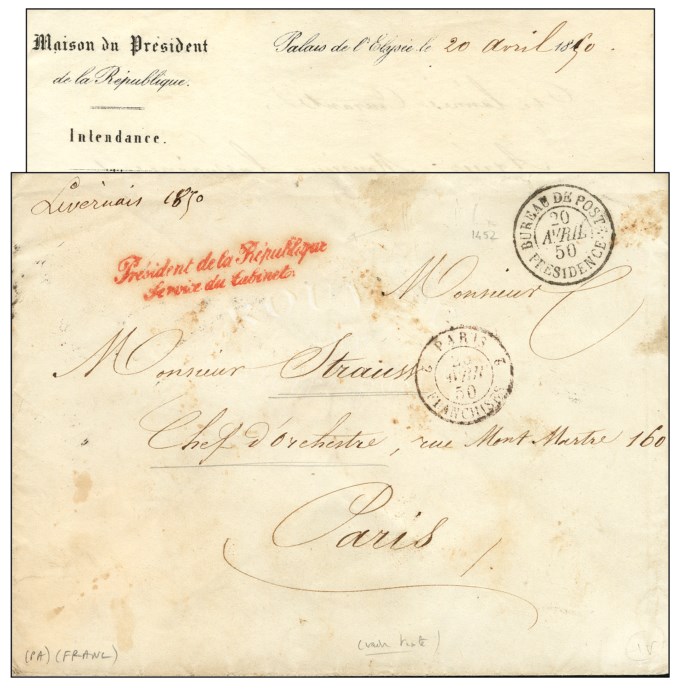 Quelques autres supports méritent l’attention. Il s’agit d’abord du courrier présidentiel. Il est facilement identifiable grâce à la « griffe présidentielle », une cursive qui existe dès 1849 et qui est institutionnalisée en 1874, sous des formes diverses et généralement de couleur rouge. Le Président de la République Française a bénéficié de la franchise postale (pour les lettres qu'il expédie dans le cadre de sa fonction) jusqu'au 1er janvier 1996, date à laquelle la Présidence a commencé à utiliser une machine à affranchir.